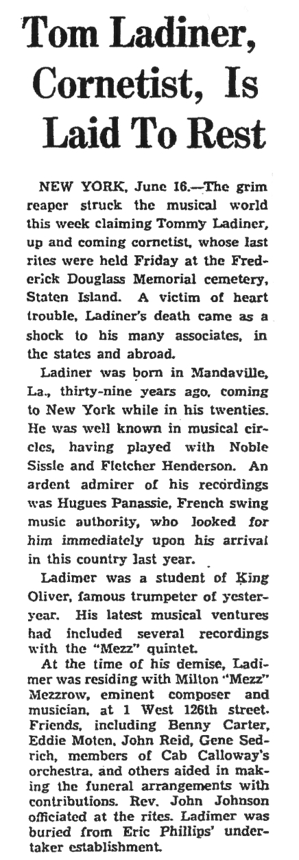After Tommy Ladnier’s death, it fell upon Mezz Mezzrow to take care of Tommy’s belongings and bury him. The funeral was set to Friday June 9, 1939 at Frederick Douglass Memorial cemetery, Staten Island, an African American cemetery.